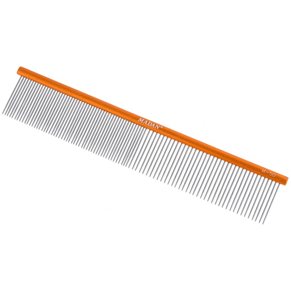 Профессиональная, чрезвычайно легкая расческа с алюминиевой ручкой от известного бренда Madan. Она имеет смешанное расстояние между зубьями 50/50, что делает ее идеальной для большинства типов шерсти. Прочные металлические штифты изготовлены из нержавеющей стали и установлены в плавно закругленном стержне. Расческа удобно лежит в руке и обеспечивая высокий комфорт работы.